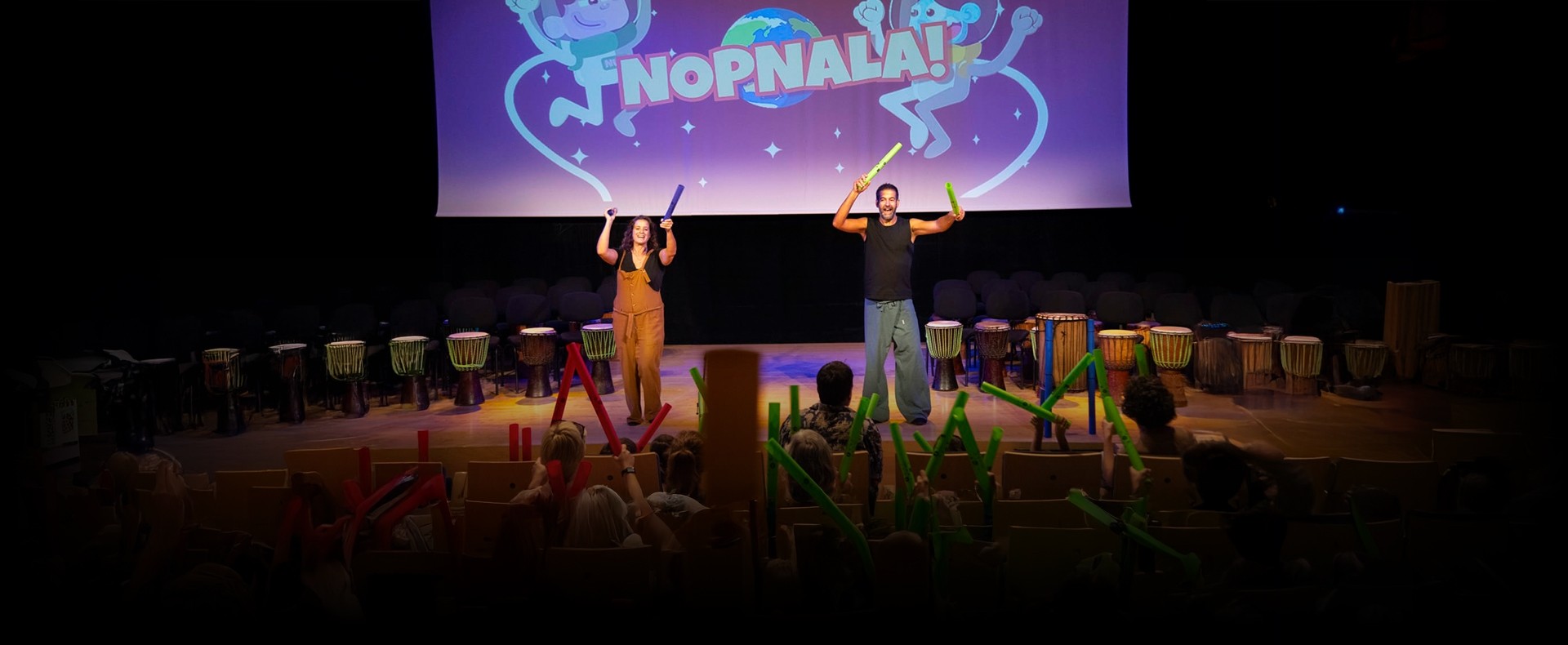 NOPNALA és un espectacle musical interactiu on els infants, amb instruments i jocs rítmics, ajuden en Nuk i la Lia a salvar el planeta. A través de la música es treballen valors ambientals i d’estima per la Terra.